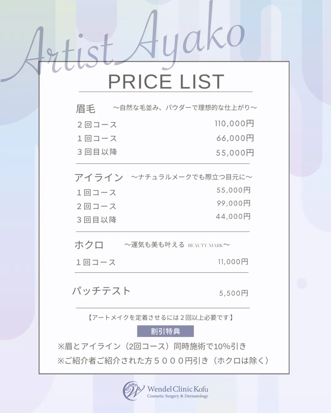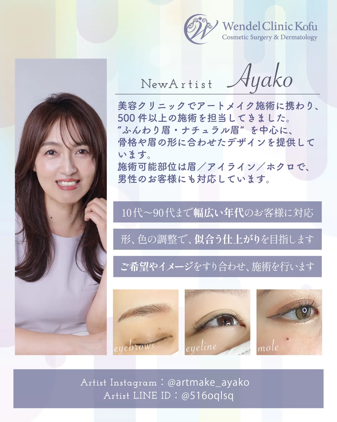 NewアートメイクアーティストAyakoのご紹介 event_note2025.12.21 施術経験豊富なアートメイクアーティストが新しく加わりました✨ アーティストAyakoをご希望の方は下記よりご予約いただけます。 皆様のご予約をお待ちしております。 アートメイクのご予約はこちらから アーティストインスタグタム