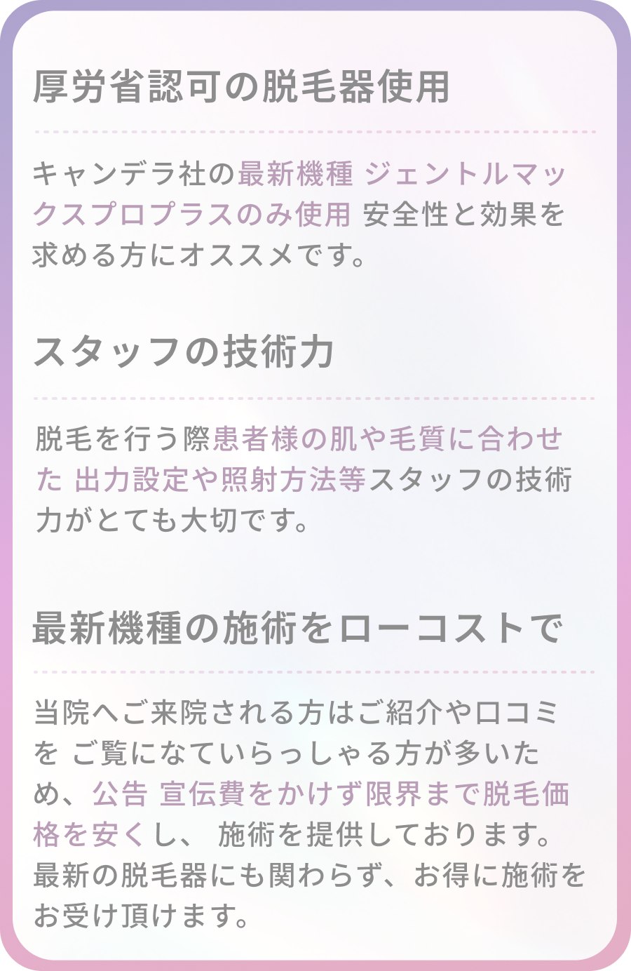 脱毛の効果を最大限に発揮するためにはマニュアル通りの施術ではなく、ひとりひとりの毛質、肌質、肌状態などを丁寧に診察して個々に設定を行う事が重要です。