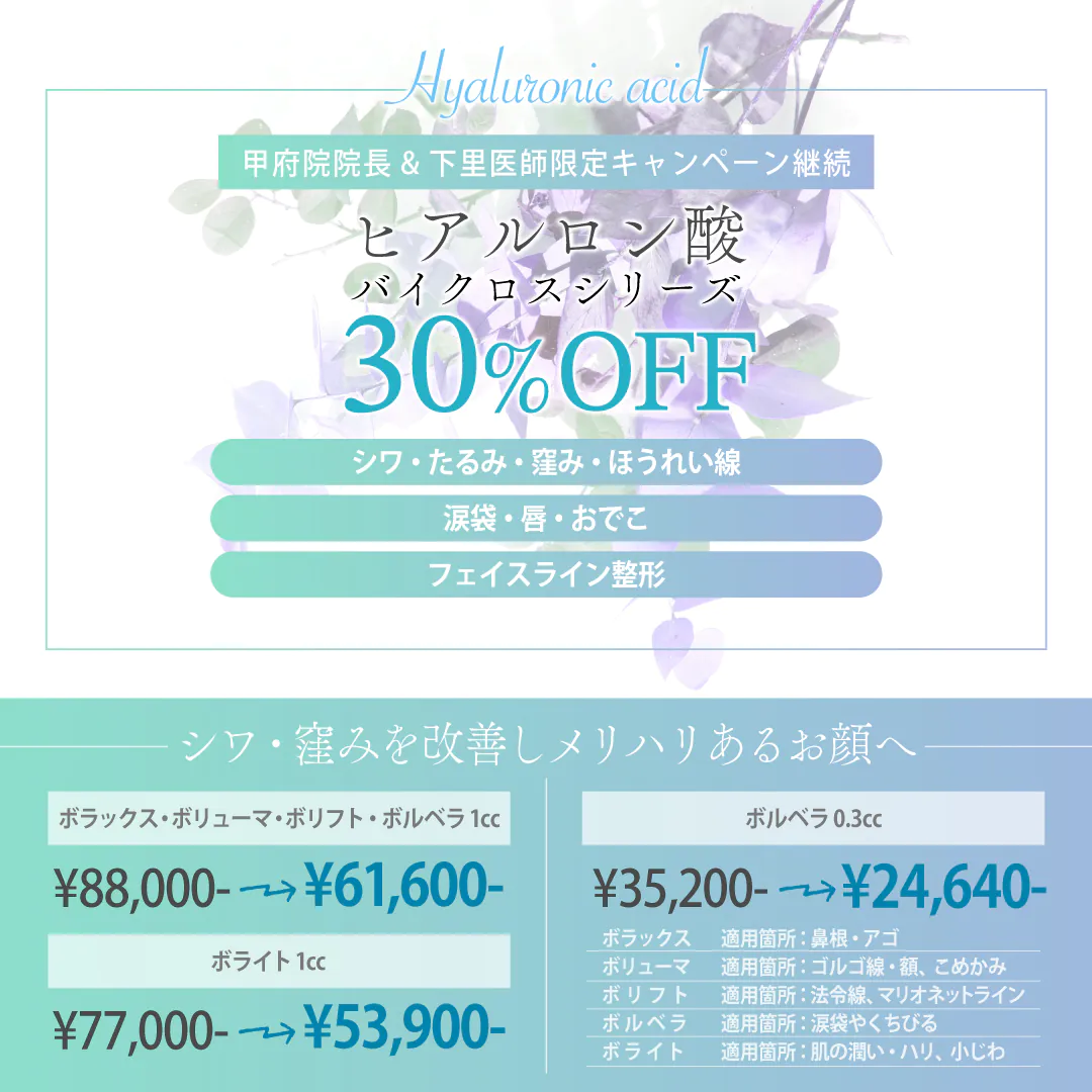 ヒアルロン酸注入でお得にお悩みを改善したい方は、ぜひ甲府院院長指名でヒアルロン酸のご相談にお越しください✨