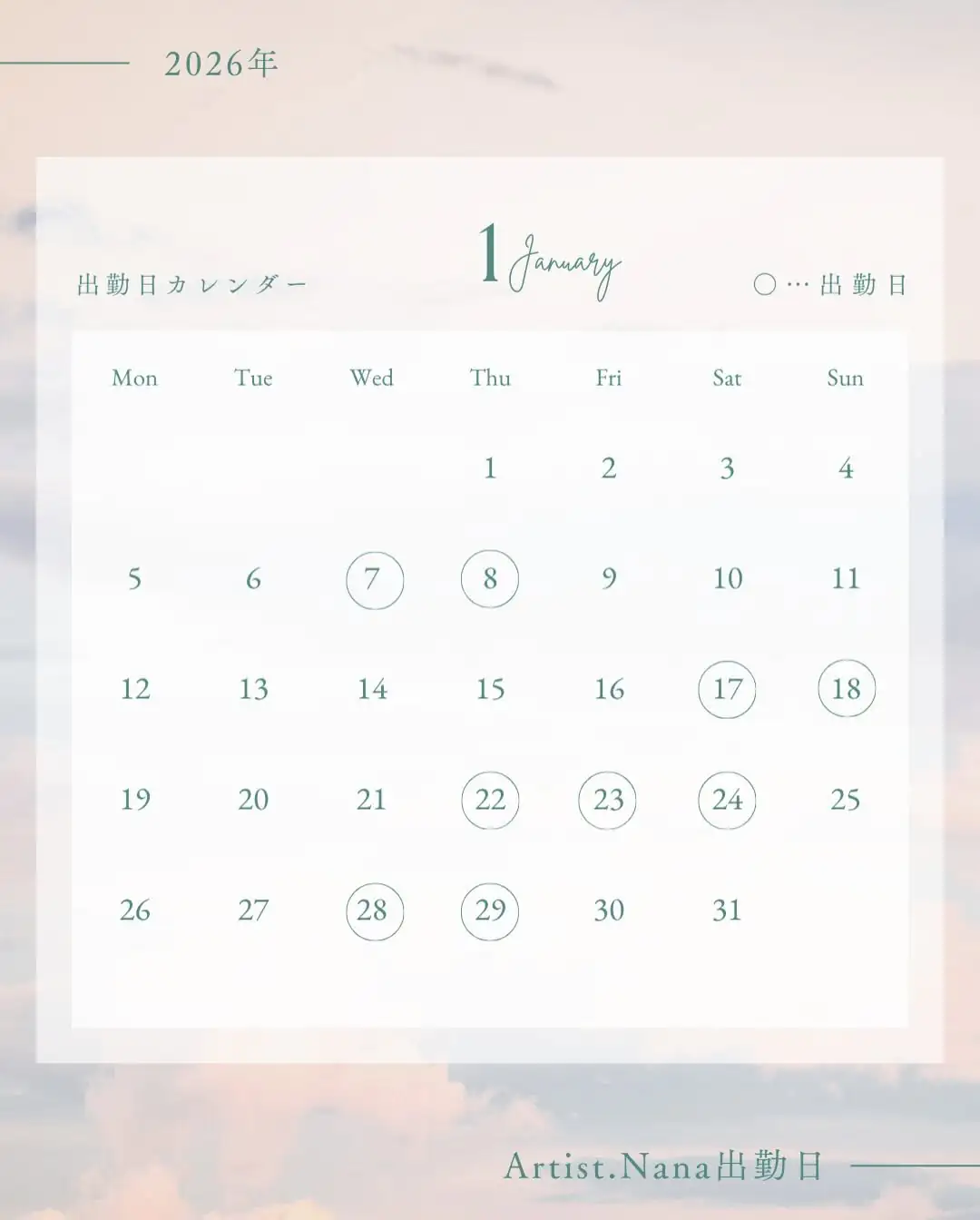 1月のアーティストNanaの出勤日をお知らせいたします✨