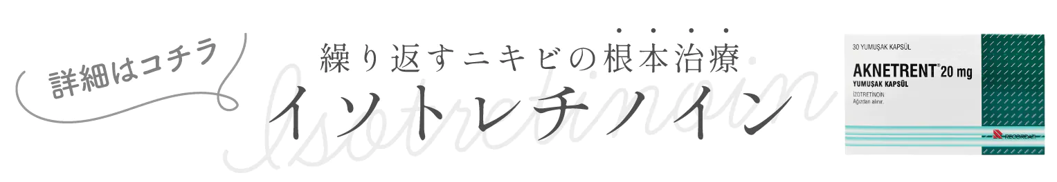 この薬は、ビタミンAの誘導体であるイソトレチノインを取り入れたもので、ロアキュタンという薬の他に、イソトロイン、アキュテインといった商品名として有名です。皮脂の分泌を抑え、アクネ菌の活動を抑制し、殺菌作用や抗炎症作用をもたらすとされています。1日1回の服用を16〜24週程度続けることが必要です。効果は人それぞれですが、早い方は4〜12週程度で効果を実感して頂けます。